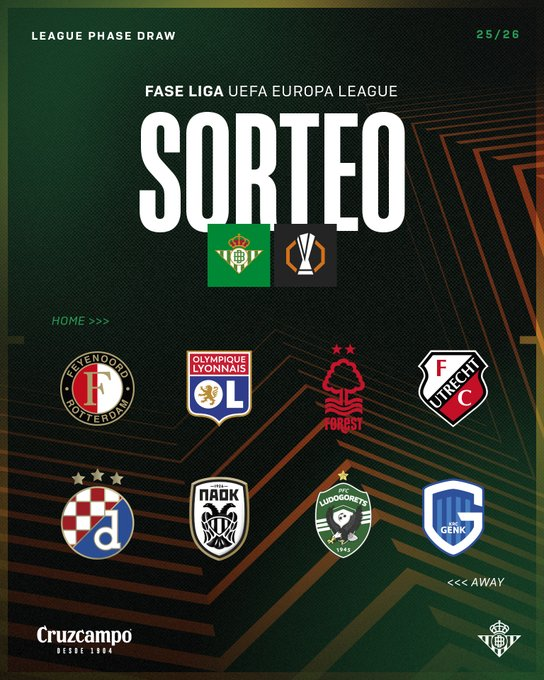 Tras realizarse el sorteo de la fase de liguilla, el Real Betis ya conoce a los que serán sus ocho rivales en la Europa League 2025/26. Después de la buena participación la temporada pasada en la Conference League, donde alcanzó la final, los de Manuel Pellegrini buscarán dar un paso más en la segunda mejor competición continental.