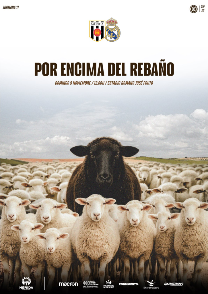 El cartel del partido publicado por la AD Mérida ha causado mucho revuelo estos días en las redes sociales, siendo incluso viral ya que da a entender que los aficionados merengues son unos borregos y la oveja negra los que apoyan al equipo de su ciudad. Además, cabe destacar que el Mérida ha tomado una medida muy bien empleada por su parte para que todos los que intenten acceder al campo con camisetas merengues serán reubicados en el fondo norte, junto a la afición visitante