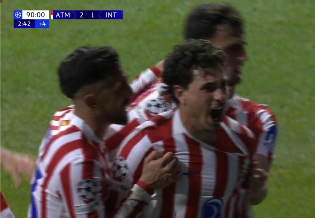 El Inter volvía fuerte del túnel de vestuarios y con ganas de empatar el encuentro lo más temprano posible. Barella le daba al larguero y Musso lo hace increíble atajando un mano a mano contra Di Marco a pase de Lautaro. El Atleti necesitaba cambios, el equipo había salido no muy bien de los 15 minutos de pausa, y el Inter había salido con todo a por los del Cholo, y antes de estos necesarios cambios llegarían las tablas al marcador a manos de Zielinski tras una pared con Bonny. Ahora sí, Simeone miraba al banquillo y preparaba los cambios de Nico, Koke y un inesperado Pubill, que entrarían por Nahuel, Gallagher y Johnny. El partido estaba apagándose y parecía incluso que a los visitantes les servía con el empate en España. Entrarían Thuram y Sucic por Bonny y Zielinski, por el otro banquillo llegarían al campo Griezmann y Sorloth por Baena y Ruggeri, un cambio muy ofensivo. En el 72´ ingresarían Pio Espósito por Lautaro y Frattesi por Calhanoglu. En la recta final del partido se retiraría del terreno de juego Di Marco y entraría a falta de 10 minutos Luis Henrique. El Atlético lo estaba dando todo, y estaba muy volcado al ataque, Giuliano ponía un centro que blocaba con seguridad Sommer. El trencilla añadía 5 minutos más de fútbol en el Metropolitano, minutos que aprovecharían los rojiblancos para sumar los tres puntos con un cabezazo de Giménez a pase de Griezmann que recordaría a la noche de la victoria frente al Leipzig. El Atleti sumaría 3 puntos y le quitaría el invicto al Inter de Milán.